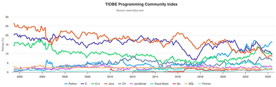 Today, there are roughly over 600 programming languages worldwide, but only about 20 of them are popular. If you’ve heard of the TIOBE Index, you’ll have a general idea of the popularity ranking of programming languages. Here is a trend chart showing the changes of the 10 most commonly used programming languages over the recent decades.