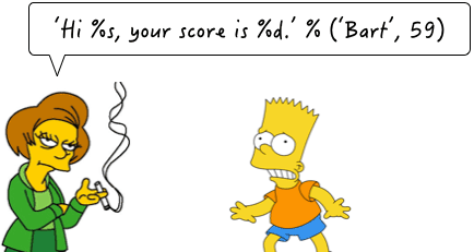 %s indicates a placeholder to be replaced by a string.%d indicates a placeholder to be replaced by an integer.You should have as many variables or values after the % as there are placeholders in the string, and they must be in the correct order. If there is only one placeholder, the parentheses around the single value can be omitted.